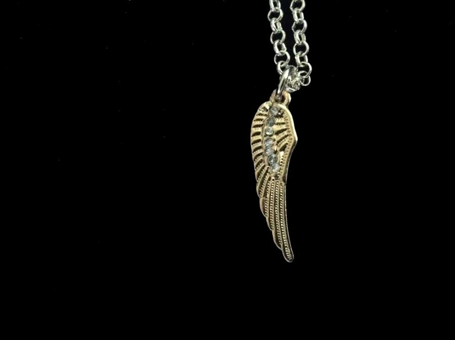 A gold metal winged pendant with a small row of jewels inlayed on it