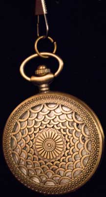 This brass colored pocket watch is about 1.8" across, and is powered by a standard A4 watch battery.