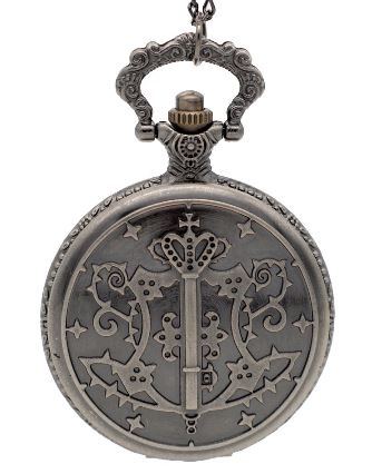 This watch has a black colored case with the Phantomhive family crest on it. It is powered by a standard A4 watch battery.
