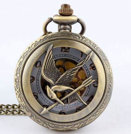 This brass colored watch comes with the Mockingjay cut out on its front, so that you can see the numbers without opening the watch, although it does open like all pocket watches. It is powered by a standard A4 watch battery.