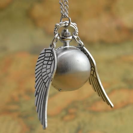 This is a silver version of our gold snitch watch. It comes on a chain to be worn as a necklace. It is powered by a standard A4 watch battery.
