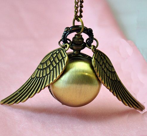 Our gold snitch watch comes on a chain to be worn as a necklace. It is powered by a standard A4 watch battery.