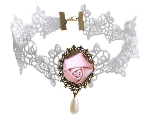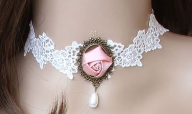 Sweet cloth pink bud on white lace choker, with white drop.
