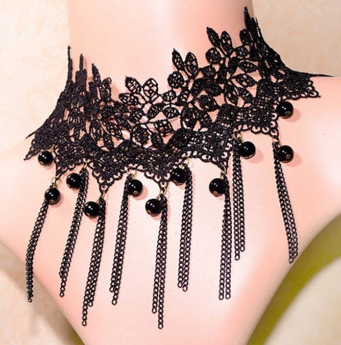 Black balls and chains hanging from wide black lace choker.