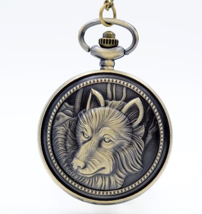 This brass colored watch is about 1.8" across, and has a wolf face on the case. It is powered by a standard A4 watch battery.