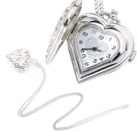 This heart shaped watch is designed to be worn as a necklace. It opens and closes via a clasp on the side. It is powered by a standard A4 watch battery.
