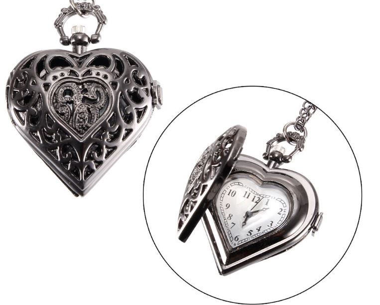 This heart shaped watch is black in color, designed to be worn as a necklace. It opens and closes via a clasp on the side. It is powered by a standard A4 watch battery.