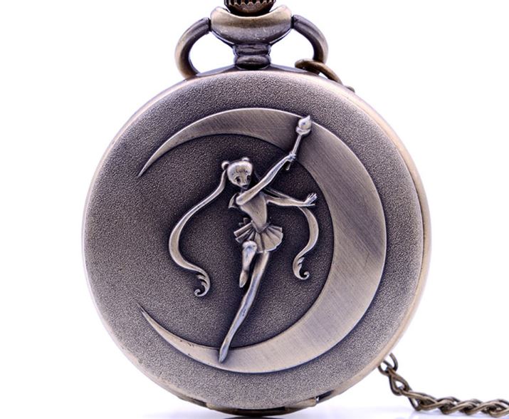 This Sailor Moon inspired watch is about 1.75" across. It has an image of Sailor Moon on the front of the case as well as on its face. It is powered by a standard A4 watch battery.