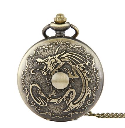 This larger (about 1.8" across) brass-colored watch has a dragon curled around the case. It is powered by a standard A4 watch battery.