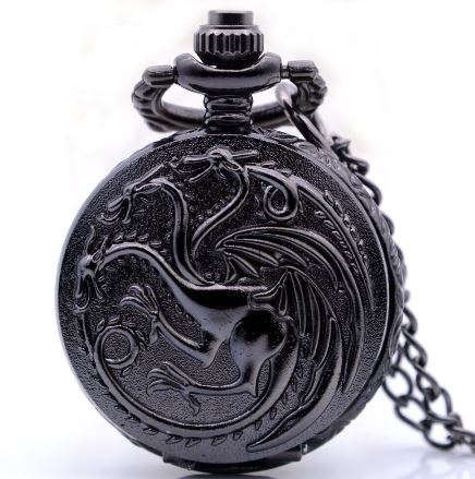 This small (about 1" across) Game of Thrones inspired black-colored watch has the Targaryen dragon on the case, and again on the face. It comes on a long chain, and is very light-weight to wear.