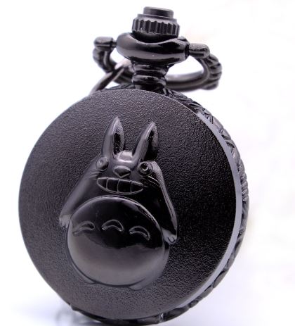 This watch is about 1" across, and has a black case with Totoro on the front of the case as well as the watch face. It is designed to be worn as a necklace. powered by a standard A4 watch battery.