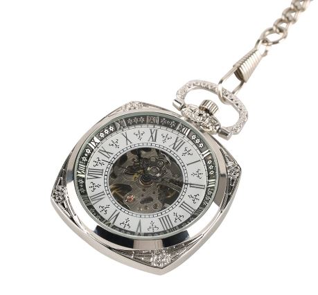 This flat hand-wound pocket watch is square in outline, with a round face. The case is silver with a white face and silver Roman numerals.