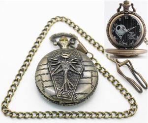 This watch is about 1.75" across, and has a black case with Jack Skellington on the front of the case as well as the watch face. It is powered by a standard A4 watch battery.